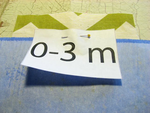 You can freehand the sizes onto your fabric with a marking pen before embroidering. I chose to print the sizes on a piece of paper first so I could trace them. Pin the paper template onto the right side of your fabric. I positioned mine about 3/4" in from the sides and top. Slip a piece of carbon paper in between the paper and fabric, and using a retracted mechanical pencil or pen, trace the template onto your fabric. Hand embroider- I used a backstitch.