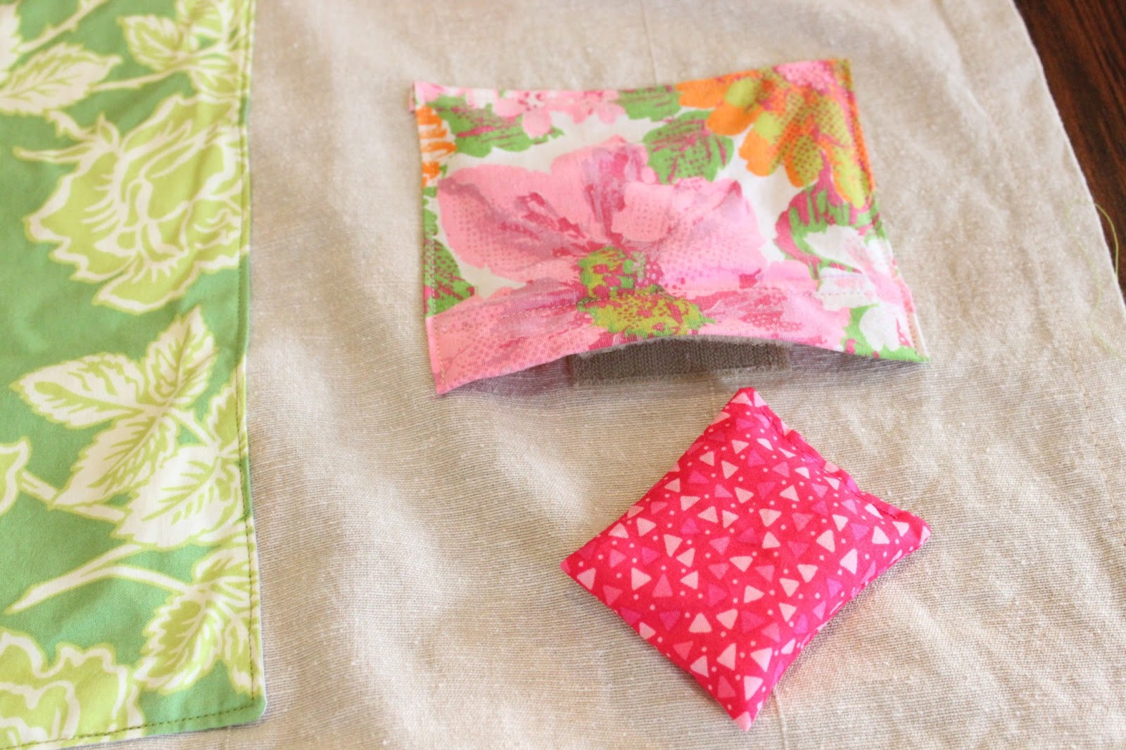 In my ever-expanding stash of fabric I had some vintage linens, including a small floral printed pouch and an embroidered pillowcase. The pillowcase was turned into a tote bag to hold the "sheets" and supplies.
